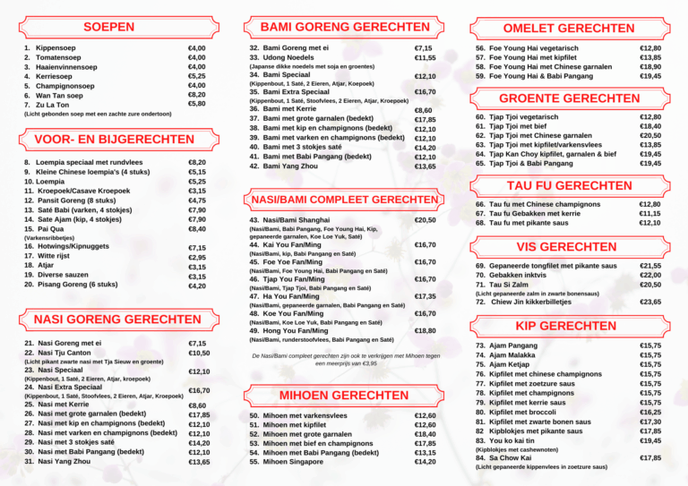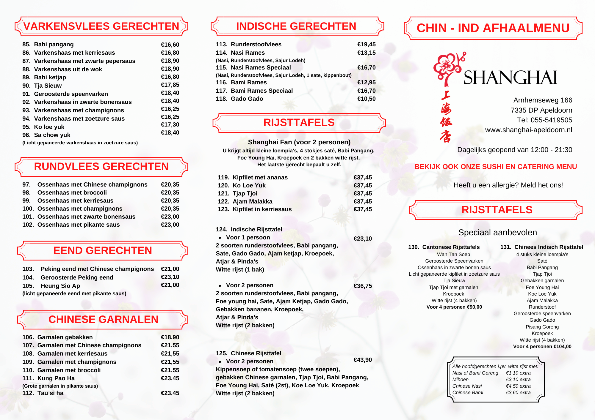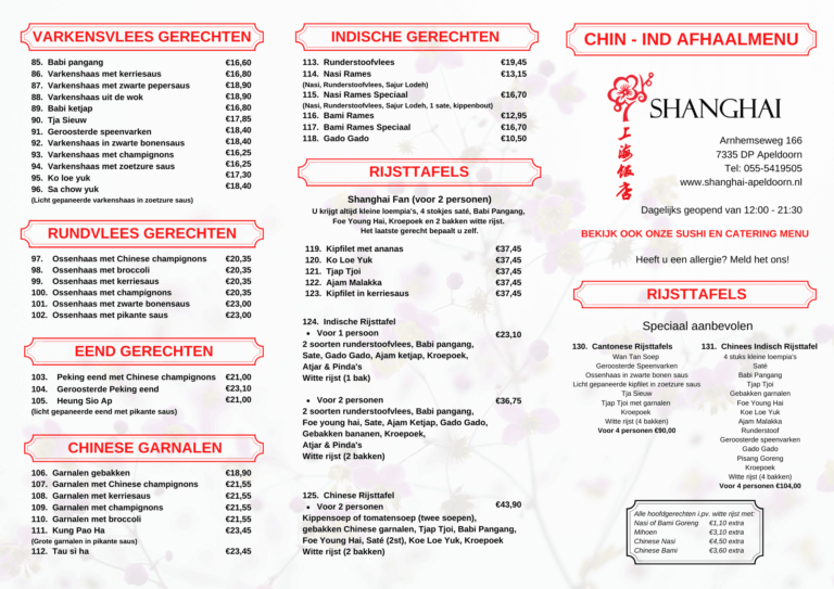 AFHALEN Dé Chinees van ApeldoornWilt u uw maaltijd thuis eten? Ook dat is mogelijk bij restaurant Shanghai. Zie hieronder ons uitgebreide en diverse menukaart om af te halen. Wij bieden ook diverse sushi aan om af te halen. Zie menu hieronder. Meeneemlijst MAANDMENU FEBRUARI 2026 Voor 2 personen €24,50 2 Kleine Loempia’s 2 Saté Babi Pangang Kipfilet met Pikante Saus Nasi Bami Kroepoek Sushi meeneemlijst